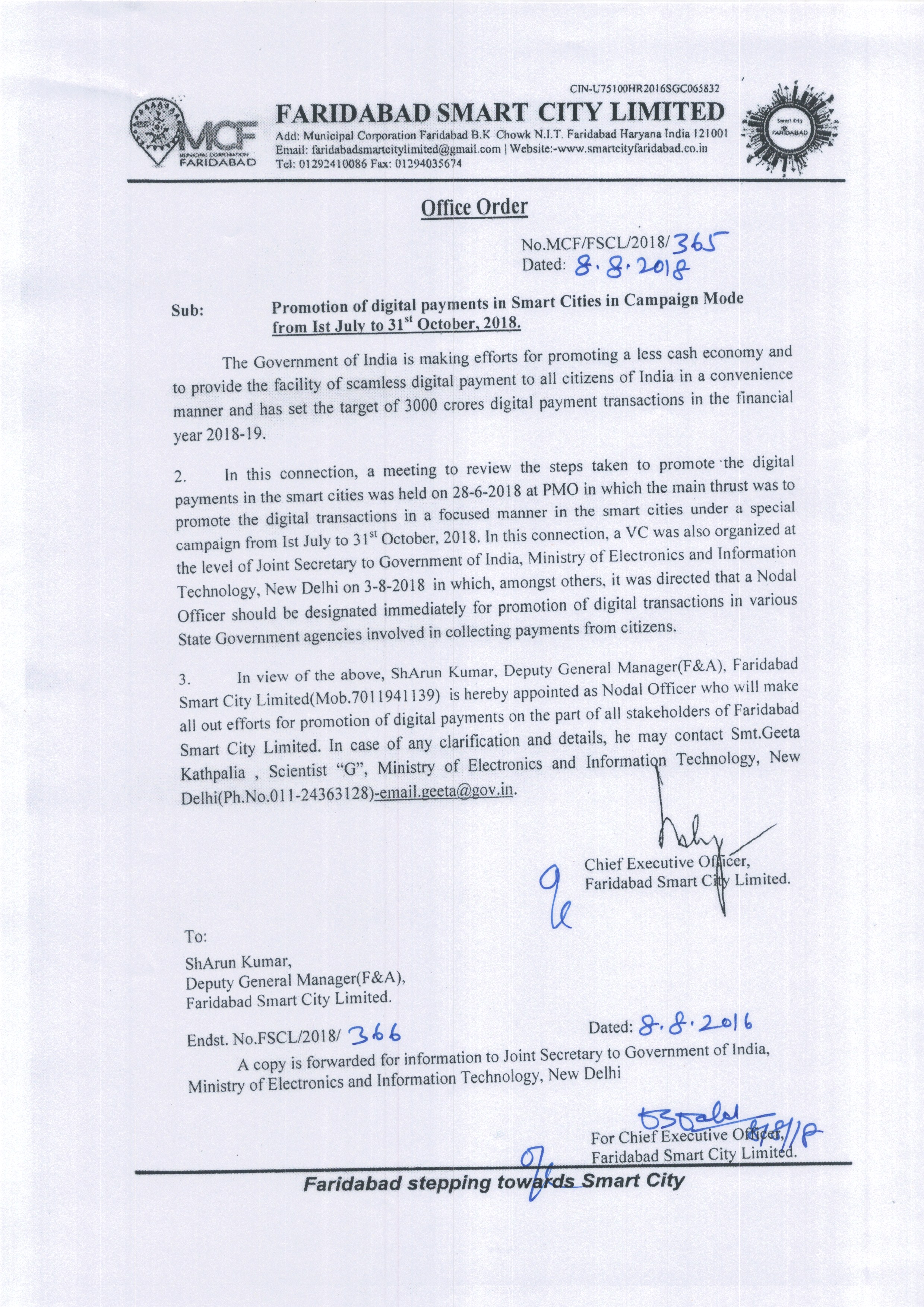 Office order of Smt. Sonal Goel,IAS, Commissioner, MCF as a Chief Executive Officer of Smart city Faridabad
